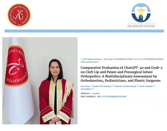 Nevşehir Hacı Bektaş Veli Üniversitesi Diş Hekimliği Fakültesi öğretim üyelerinden Dr. Öğr. Üyesi Esra Ekizer, uluslararası saygın bir bilimsel dergide yayımlanan çalışmasıyla önemli bir akademik başarıya imza attı. “Comparative Evaluation of ChatGPT-4o and Grok-3 on Cleft Lip and Palate and Presurgical Infant Orthopedics: A Multidisciplinary Assessment by Orthodontists, Pediatricians, and Plastic Surgeons” başlıklı çalışma, dudak-damak yarıkları ve cerrahi öncesi bebek ortopedisi alanında yapay zekâ destekli yaklaşımların değerlendirilmesine odaklanmaktadır. Çalışmada, farklı disiplinlerden uzmanların görüşleri doğrultusunda güncel yapay zekâ sistemlerinin klinik bilgi doğruluğu ve kullanılabilirliği çok yönlü olarak incelenmiştir. Uluslararası bilim dünyasında dikkat çeken bu çalışma, hem yapay zekânın sağlık alanındaki potansiyelini ortaya koyması hem de multidisipliner yaklaşımıyla literatüre önemli katkı sağlamaktadır. Fakültemizi başarıyla temsil eden kıymetli hocamız Dr. Öğr. Üyesi Esra Ekizer’i tebrik eder, akademik çalışmalarında başarılarının artarak devamını dileriz.