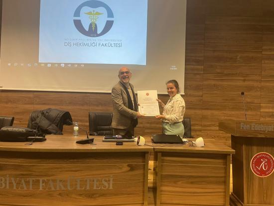 Programın sonunda, eğitime katkılarından dolayı Doç. Dr. Ergin Erginer’e teşekkür belgesi, Fakültemiz Dekan Yardımcısı Dr. Öğr. Üyesi Işınsu Alkan tarafından takdim edildi.